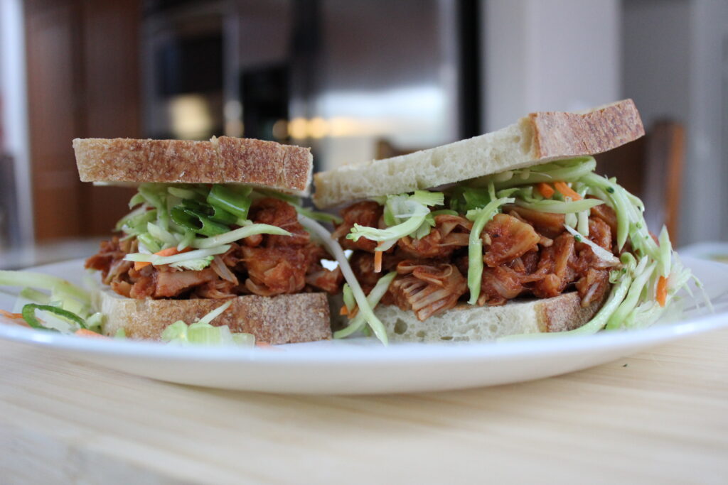 - Once your jackfruit has cooked, assemble your sandwiches. Serve with potato wedges or fresh watermelon!